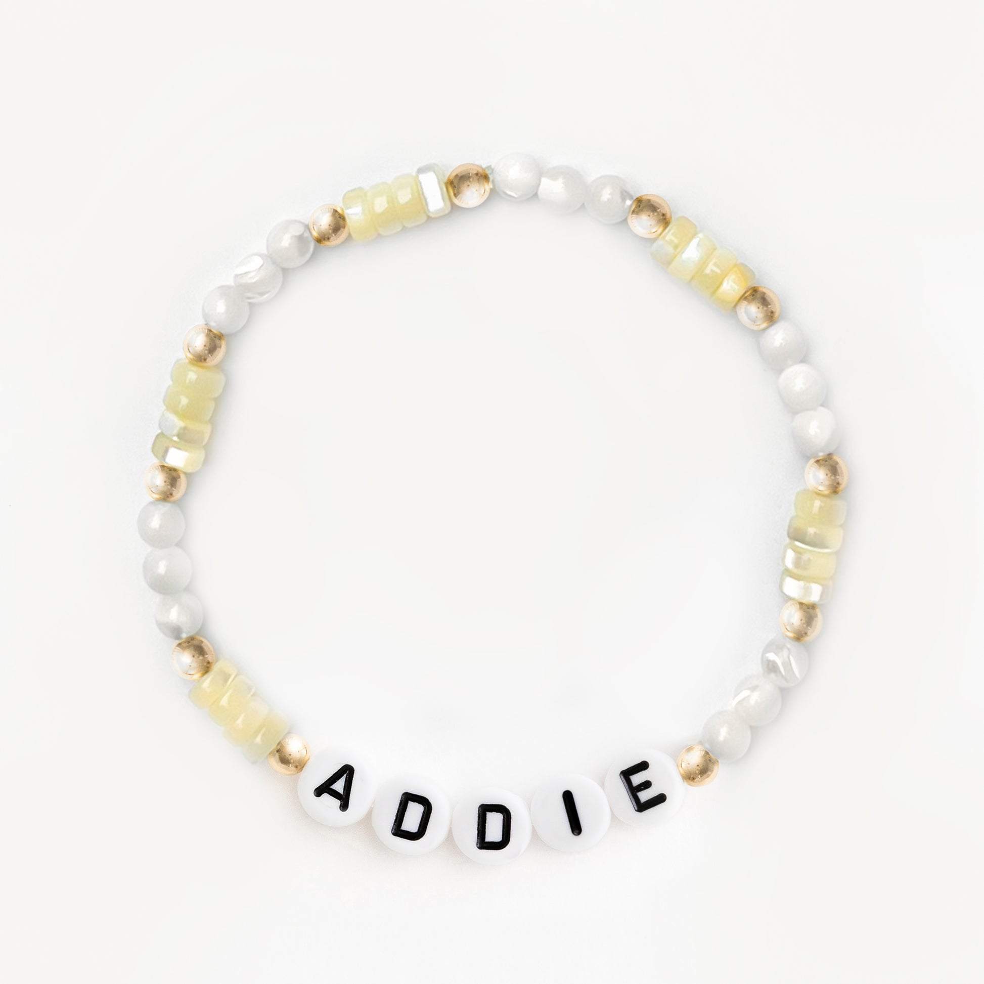 4mm round mother of pearl beads and yellow-dyed mother of pearl heishi beads with your choice of 14k gold filled accents or sterling silver accents