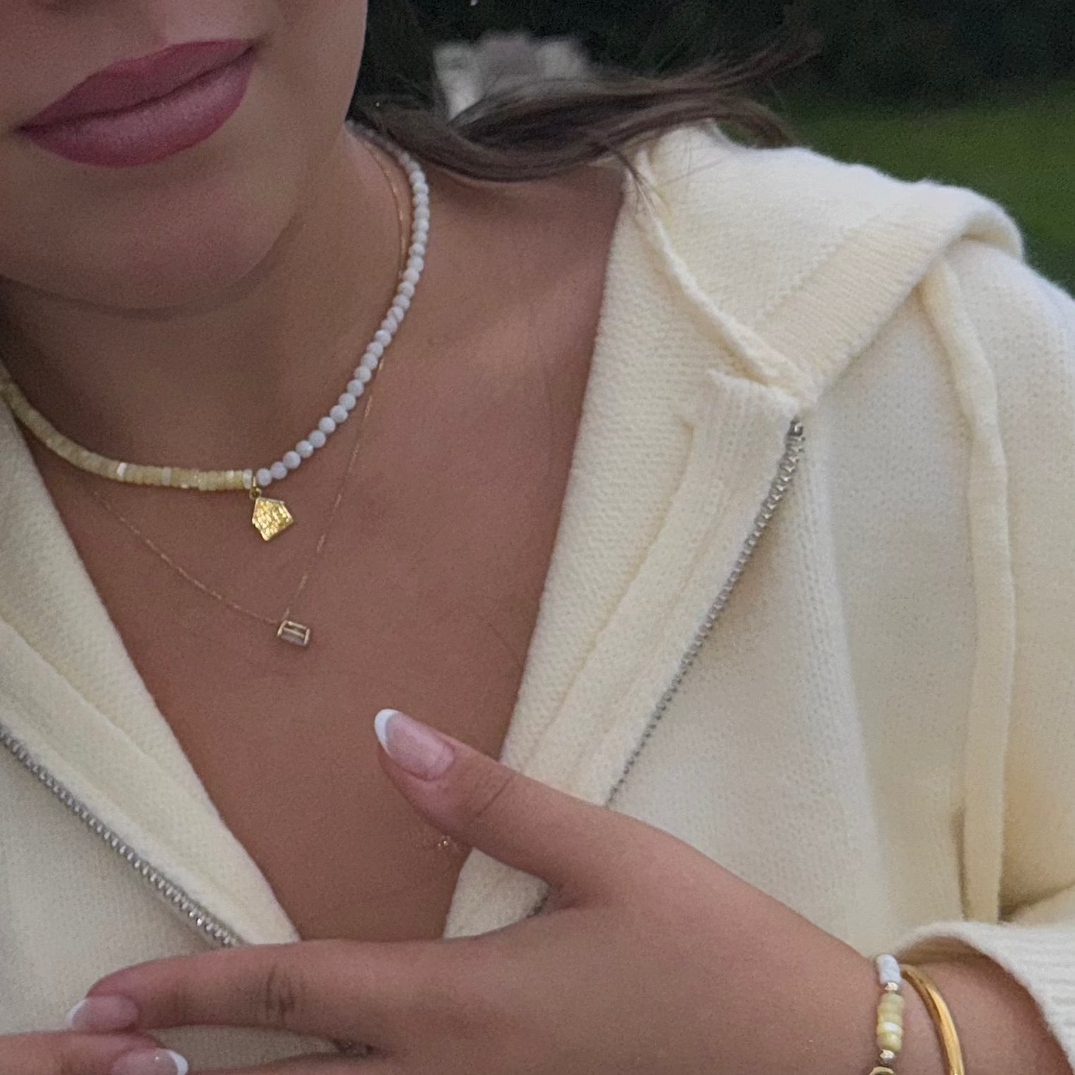 4mm round mother of pearl beads and yellow-dyed mother of pearl heishi beads with your choice gold-filled charm (16")