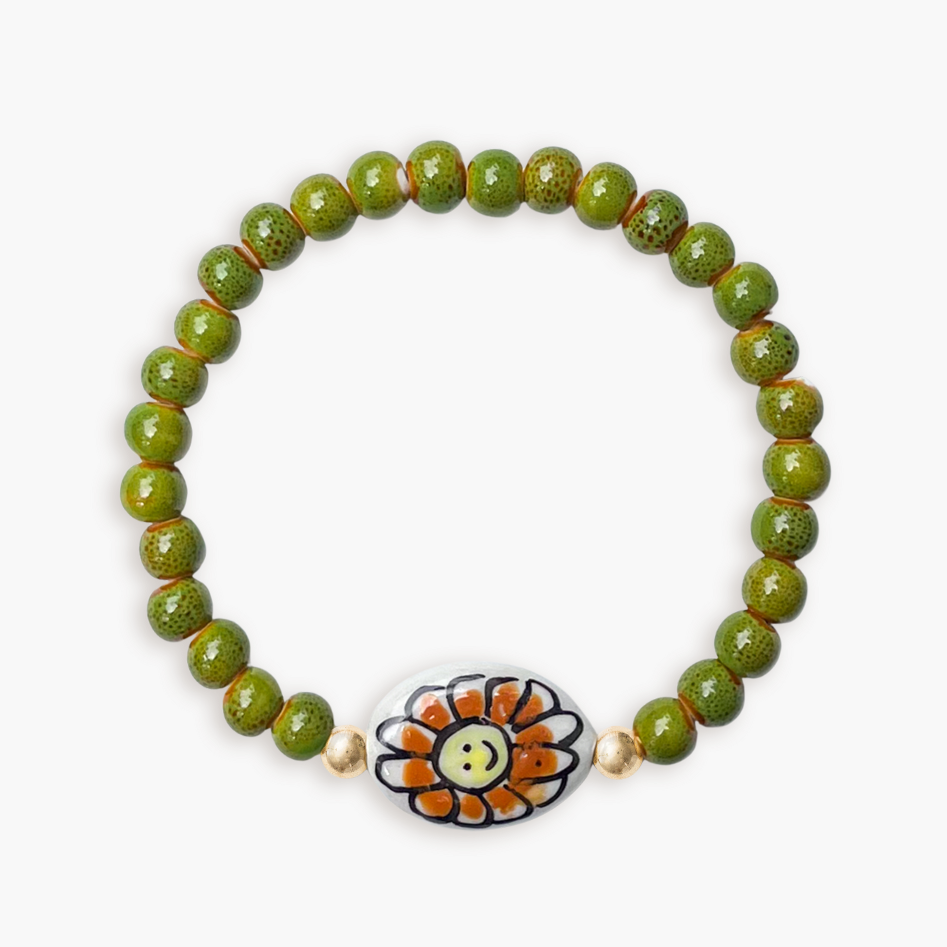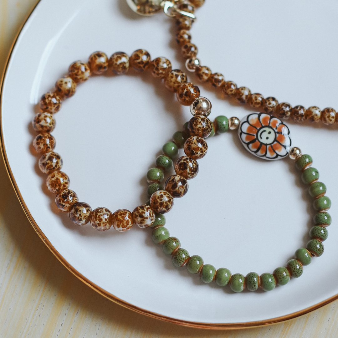 6mm antique glazed porcelain ceramic beads with a handmade, hand-painted flower bead and choice of 14k gold filled or sterling silver accents