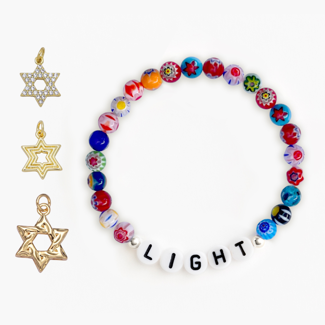 No two bracelets are the same! Round bead and cross bead color will be randomized. 6mm colorful Millefiori round beads with 14K gold filled or sterling silver end beads and choice of gold filled star of david charm