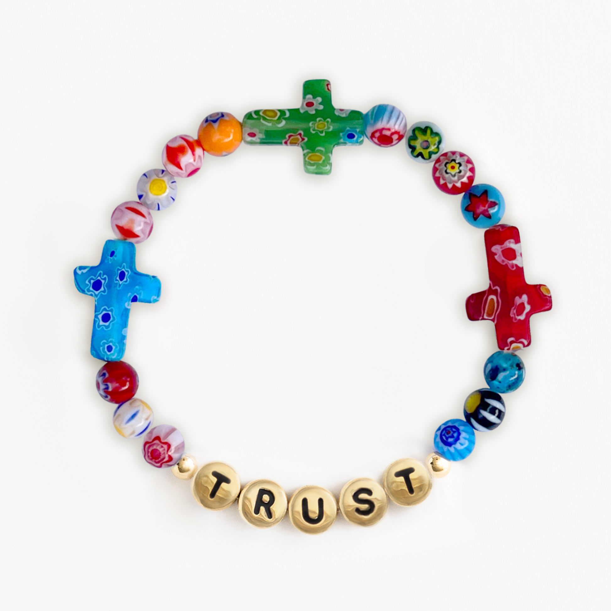 No two bracelets are the same! Round bead and cross bead color will be randomized. 6mm colorful Millefiori round beads with 17mm handmade Millefiori crosses and choice of 14k gold filled or sterling silver end beads